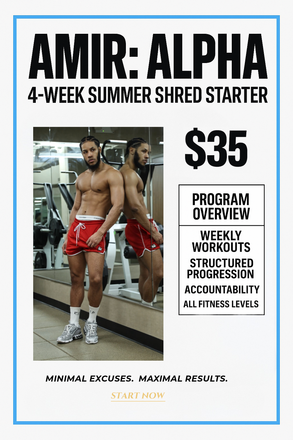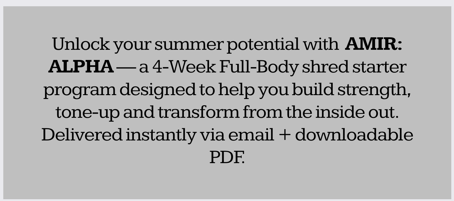 AMIR: ALPHA AMIR: ALPHA AMIR: ALPHA WEEKLY STRENGTH-ENDURANCE FOCUSED WORKOUTS 5-DAY SPLIT (UPPER, LOWER & FULL BODY) PROGRESSIVE FORMAT — DROP SETS & INTENSITY CLIMBS DESIGNED FOR ALL FITNESS LEVELS 4-Week Summer Shred Starter START NOW REAL PROGRESS. REAL RESULTS. JOIN NOW