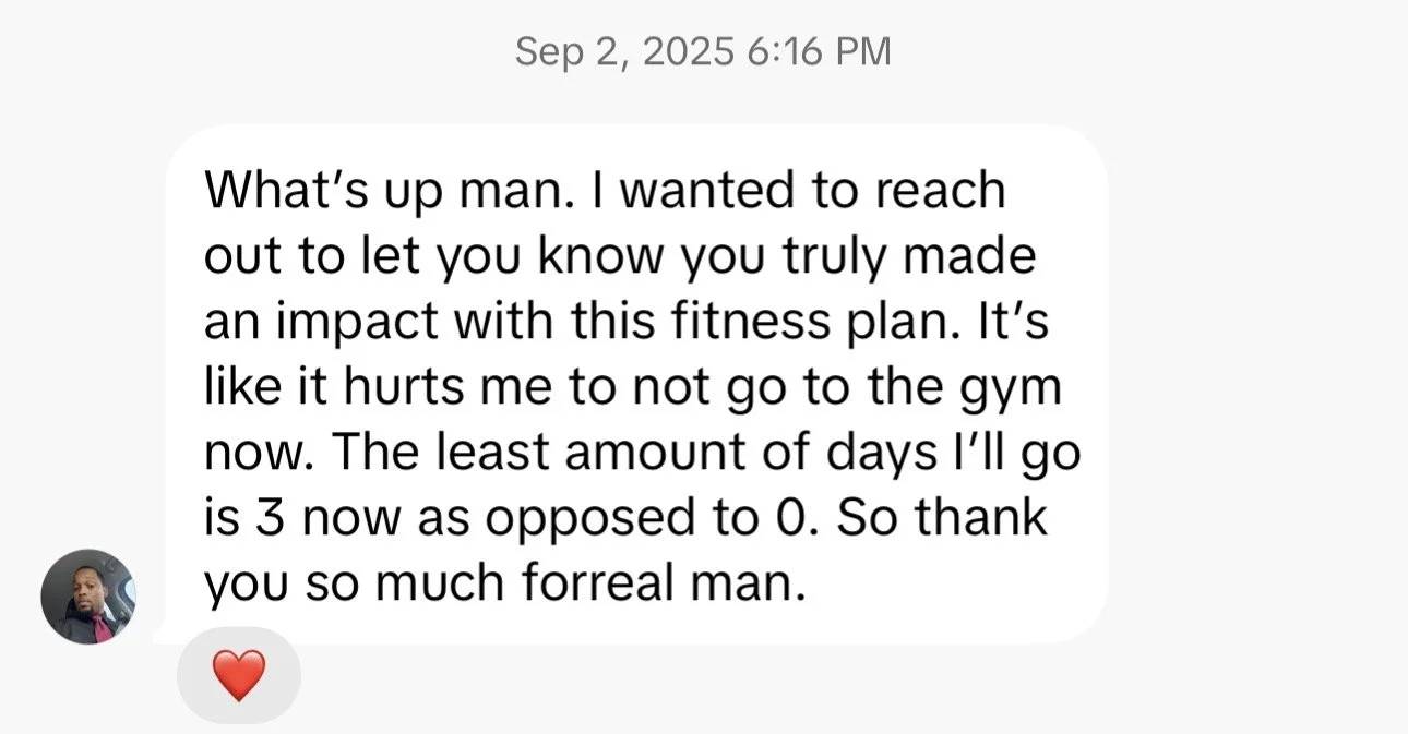 “You truly made an impact with this fitness plan. It’s like it hurts me not to go to the gym now. The least amount of days I’ll go is 3 now as opposed to 0. So thank you so much forreal man”